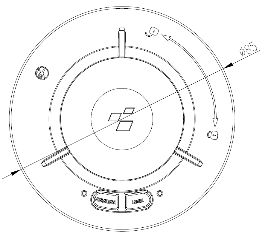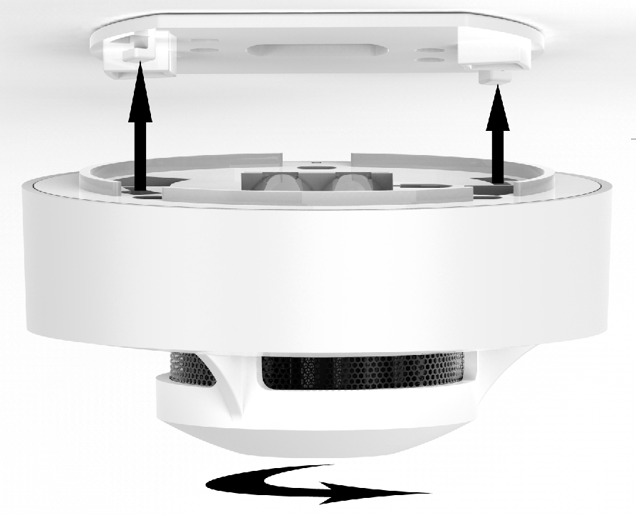 c. Sätt i krokarna på monteringsplattan till larmets slitsar. Vrid larmet medsols tills det snäpper på plats. (Se figur 3)