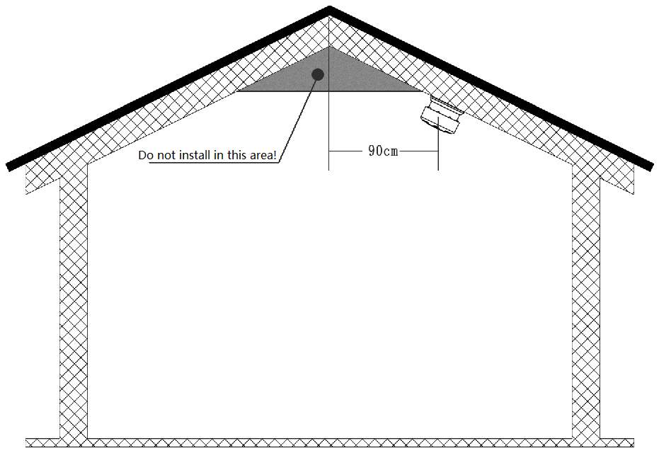 Om du installerar röklarmet på sluttande eller toppat tak ska installationsläget vara minst 90 cm från den högsta punkten.